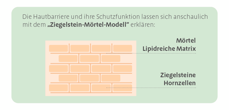 Die Epidermis, die äußerste Hautschicht, ist in fünf verschiedene Schichten unterteilt. Die oberste Schicht der Epidermis wird als Hornschicht bezeichnet und kann metaphorisch als schützendes Mauerwerk betrachtet werden. Diese setzt sich aus "Ziegelsteinen" zusammen, den Hornzellen, die wiederum von einer Art "Mörtel" umgeben sind - einer lipidreichen Matrix. Diese Lipide, auch als Fette bekannt, lagern sich zwischen den Zellen in einer Doppelschicht-Struktur, den sogenannten Lipidlamellen, an.13 Ein durch Neurodermitis oder trockene Haut verursachter Mangel an bestimmten Lipiden kann diese Struktur stören und somit die Hautbarriere schwächen.14 Daher spielt die intakte Struktur dieser Lipide eine wichtige Rolle, um die Haut vor Feuchtigkeitsverlust und äußeren Einflüssen schützen zu können.