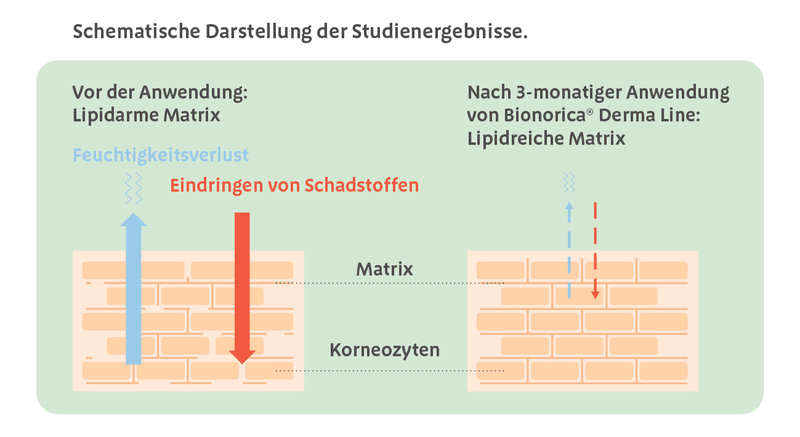Nach regelmäßiger Anwendung der Bionorica® Derma Line (2x täglich Lotion und Intensivpflege bei Bedarf) konnte über drei Monate hinweg im Rahmen einer klinischen Studie nachweislich der Gehalt besonderer Lipide erhöht und die Struktur der Lipide („Lipidlamellen“) verbessert werden. Durch die kontinuierliche Anwendung konnten Bereiche mit keinen oder weniger Lipidlamellen, die als „Lücken“ in der Hautbarriere erscheinen, nachweislich verringert werden. Durch das Schließen dieser „Lücken“, repariert die Bionorica® Derma Line nachhaltig die geschädigte Hautbarriere und reduziert so Juckreiz, Rötung und Schuppung. Eine verbesserte Hautbarriere schützt außerdem besser vor schädlichen Umwelteinflüssen, wie Krankheitserreger.